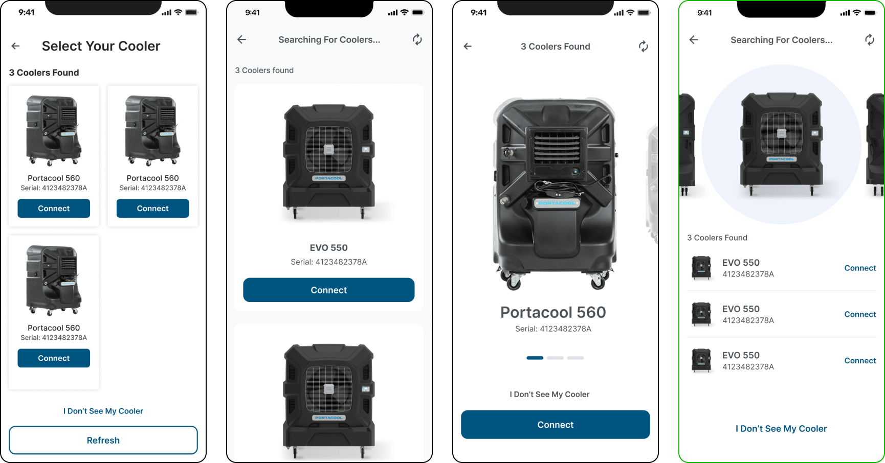 After several explorations of the device selection screen in the cooler onboarding phase, we decided to go with the solution that made it easy to browse through 10+ available coolers. Even though initially most users will only have 1-3 devices available, we decided on the layout that would be easy to navigate for even edge cases of 10+ devices.